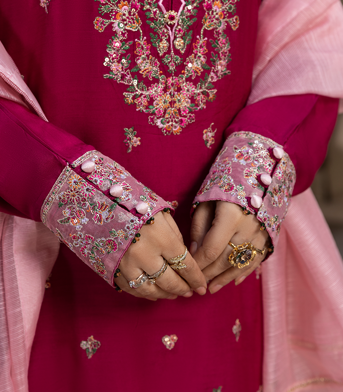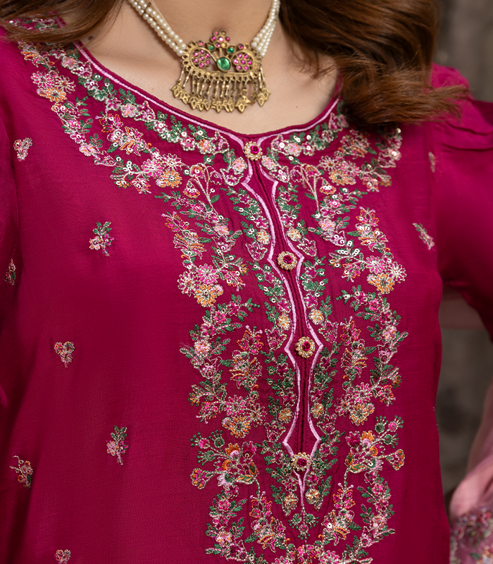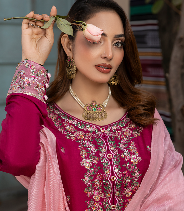 Atash in a rich purple plum shade features elegant embroidery on the neckline and sleeves, with delicate motifs spread across the shirt for a graceful look. The soft bayon viscose fabric gives a smooth fall and comfortable wear, while the matching plazo keeps the design balanced and classy.