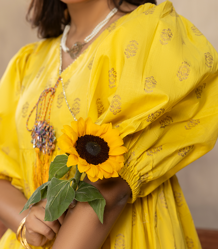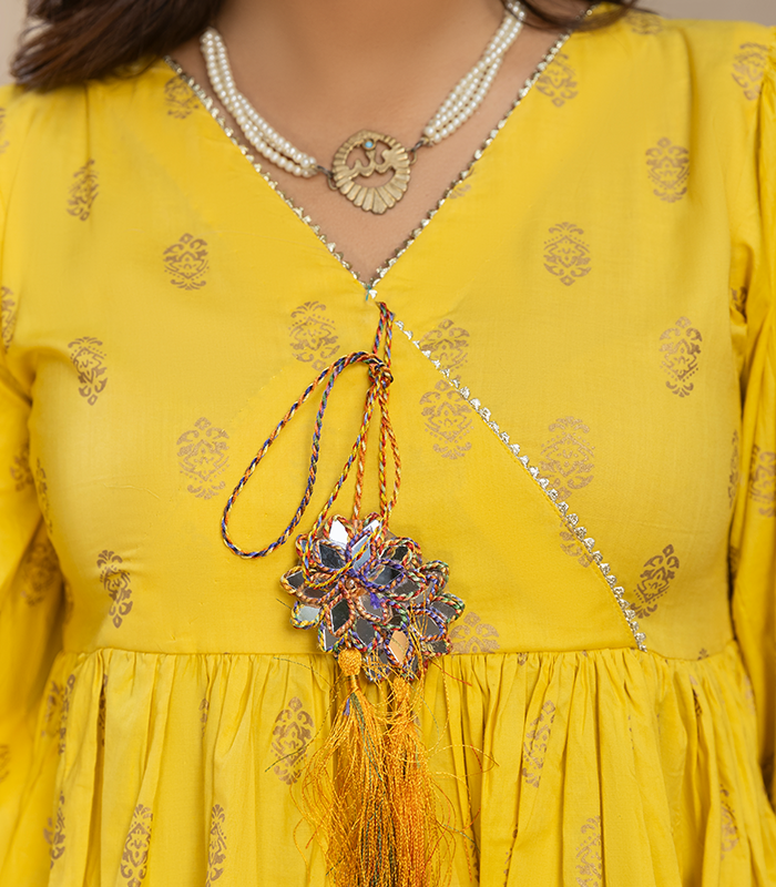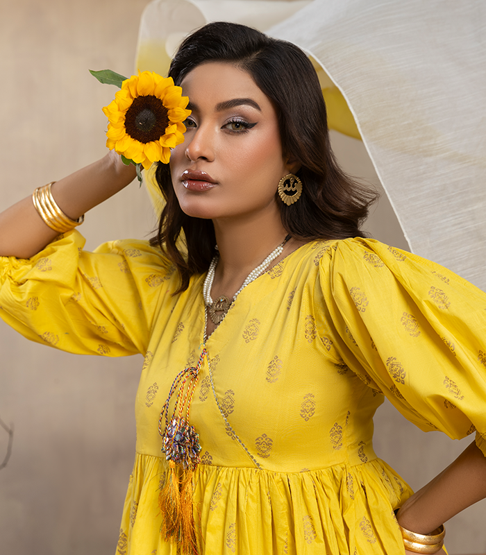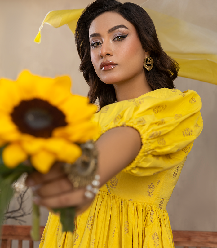 Horiya in bright canary yellow features delicate all-over printed/embroidered motifs on the short frock, giving it a fresh and graceful look. The Bareeze cotton fabric is light, breathable, and perfect for all-day comfort. The matching plazo is finished with subtle motif detailing, keeping the design balanced and elegant.
