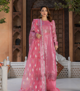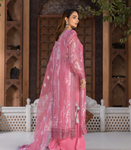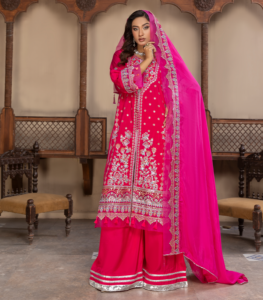 Finished with a sheer organza dupatta, this outfit is ideal for evening wear, festive gatherings, and special occasions.