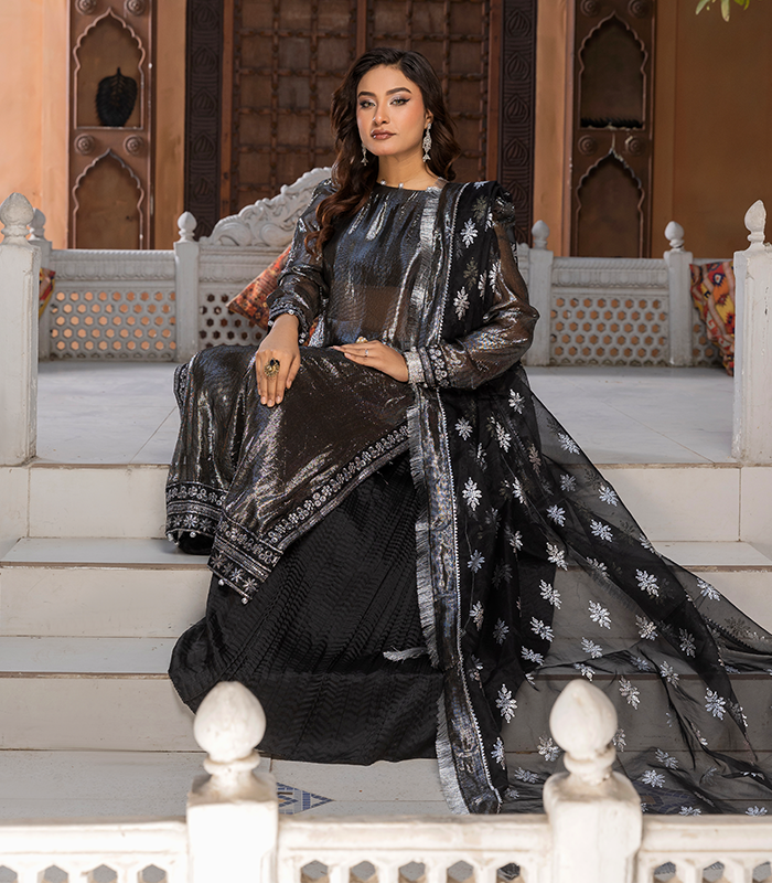 Husn Ara in classic black features subtle silver detailing and embroidered borders on the kurta, giving it a rich festive look. The shiny silver chiffon fabric adds a graceful shimmer, while the Russian grip plazo and tailored blouse keep the silhouette structured and elegant.