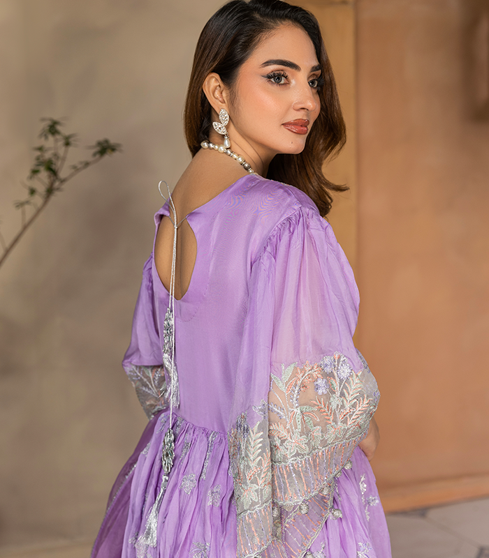 Mah Rukh in soft lavender features intricate embroidery on the front panel, neckline, and sleeves, beautifully highlighted with fine threadwork and delicate embellishment. The Chanderi silk open frock has a subtle sheen and graceful flow, paired with a structured blouse and smooth Korean raw silk plazo for an elegant silhouette.