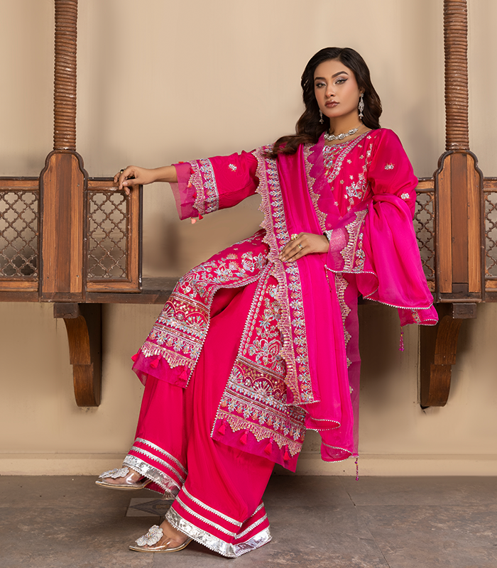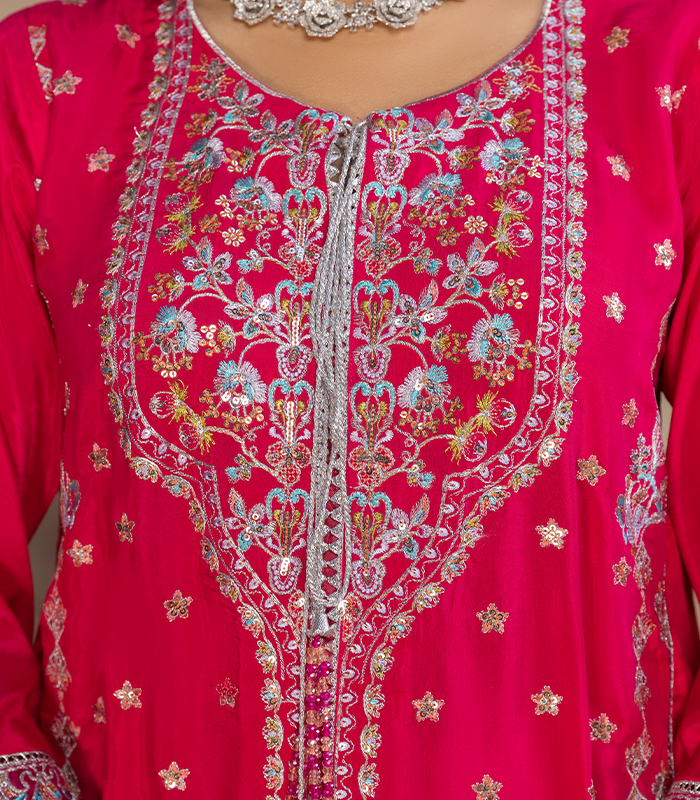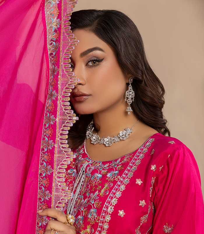 Paired with a flowing shesha silk dupatta finished with embroidered borders, this outfit is perfect for festive celebrations, formal events, and special occasions.