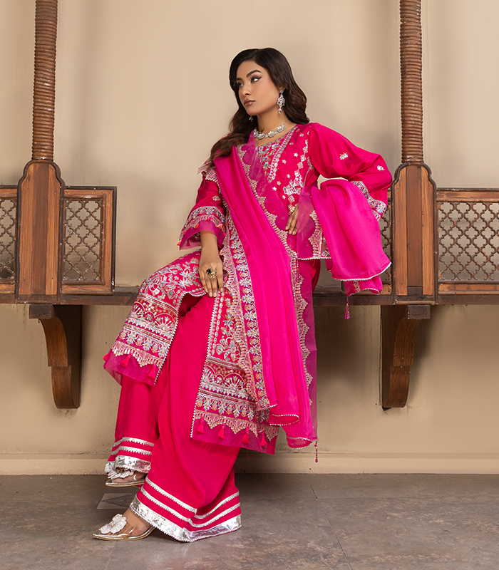 Raha in striking fuchsia pink features heavy embroidery on the front panel, neckline, sleeves, and hem, with fine threadwork and detailed motifs that give it a rich festive look. The pure raw silk kurta and trousers offer a luxurious texture with a graceful fall, creating an elegant traditional silhouette.