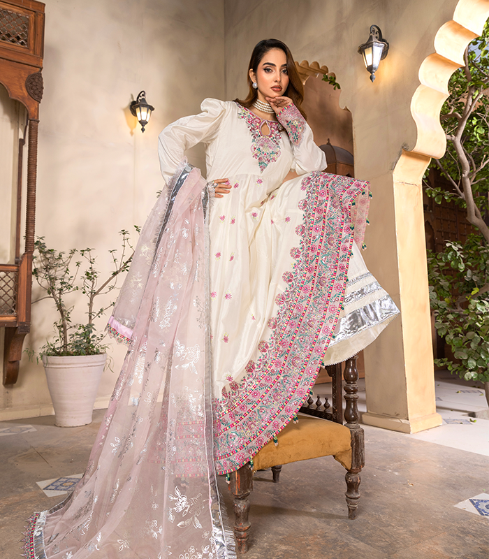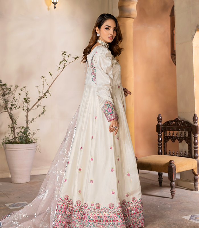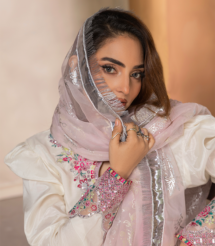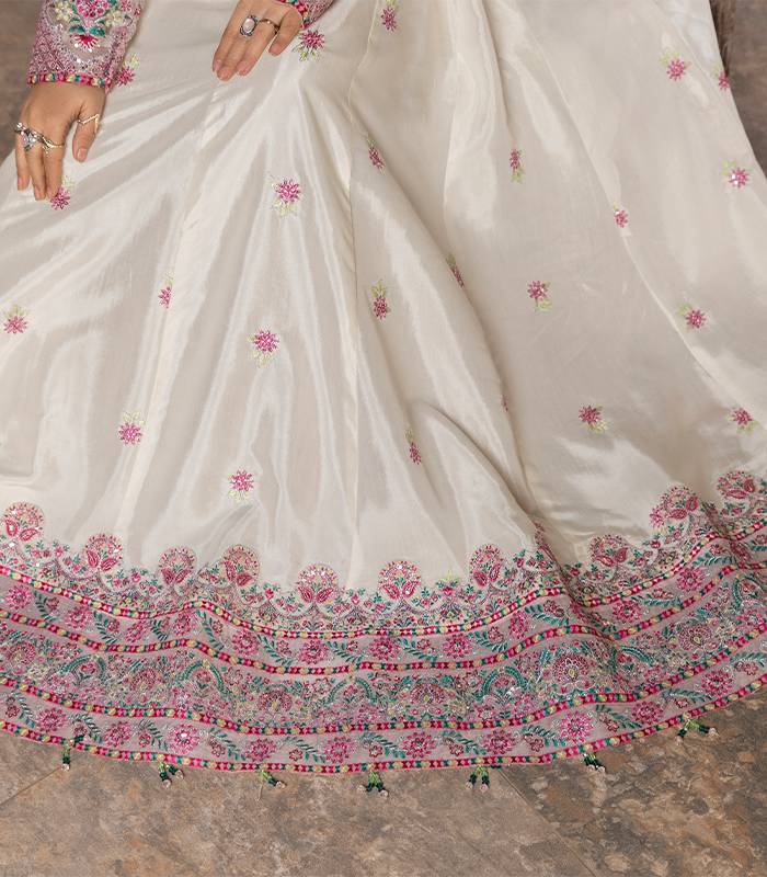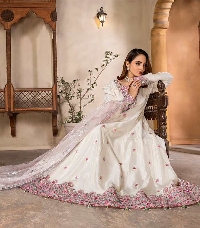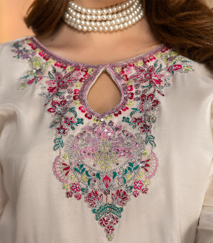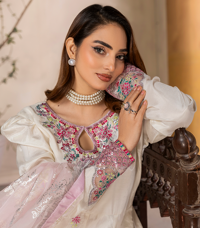 Rohina in elegant ivory features delicate embroidery on the neckline, sleeves, and frock hem, finished with fine threadwork and subtle embellishments for a graceful look. The pure satin silk fabric gives a smooth shine and a beautiful flow, while the matching plazo completes the silhouette with timeless elegance.