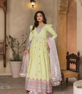 Paired with a sheer organza dupatta, this outfit is perfect for formal events, festive occasions, and elegant day wear.